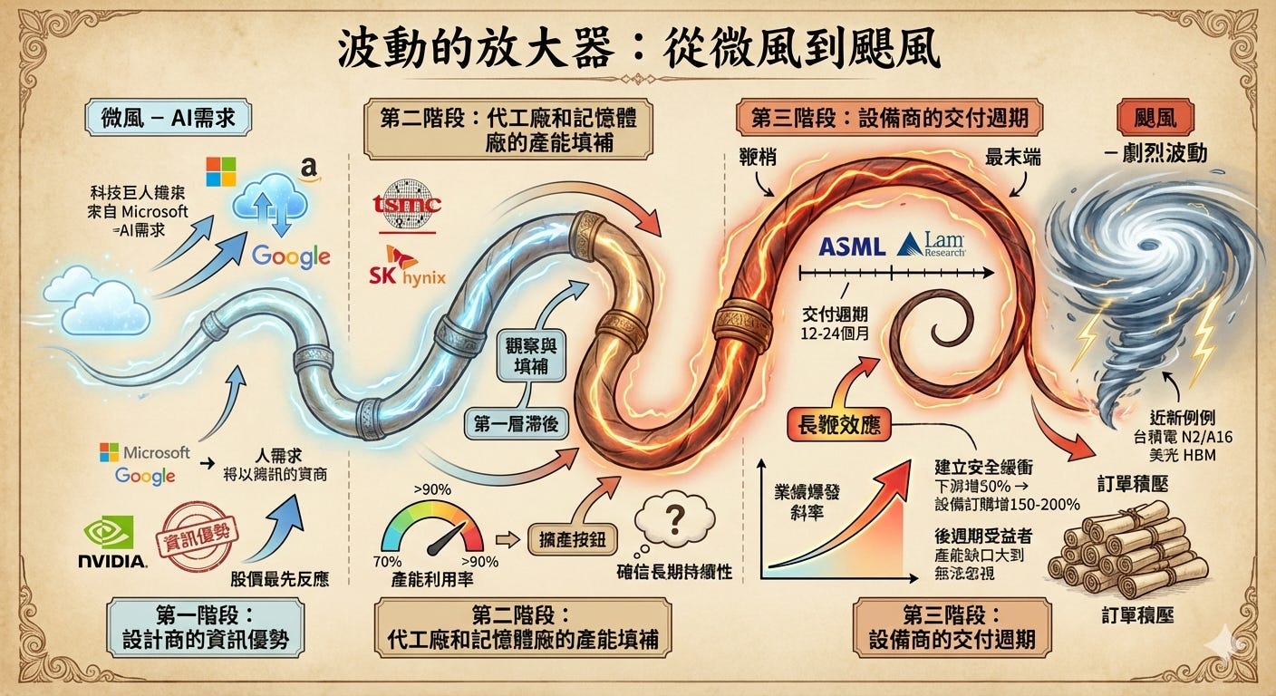 這必須歸因於供應鏈的「長鞭效應」(Bullwhip Effect)。處於最上游的設備商,往往最後才感受到風向,但感受到的力道卻是最強的。
