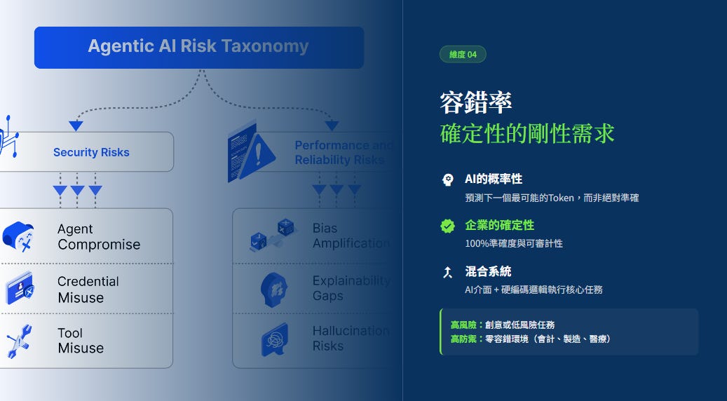 AI 是概率性的 (Probabilistic),它預測下一個最可能的 Token。但在需要 100% 準確度與可審計性的企業環境中,則可能構成災難性的「責任缺口 」
