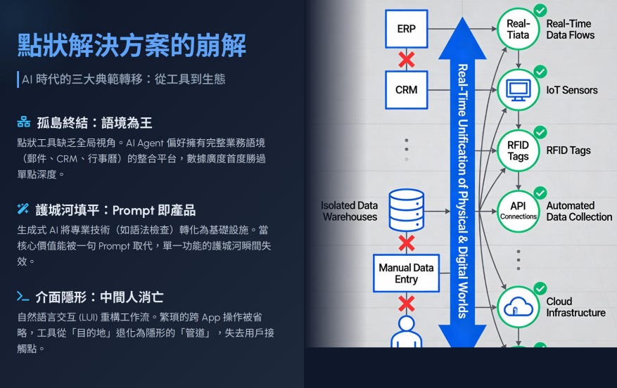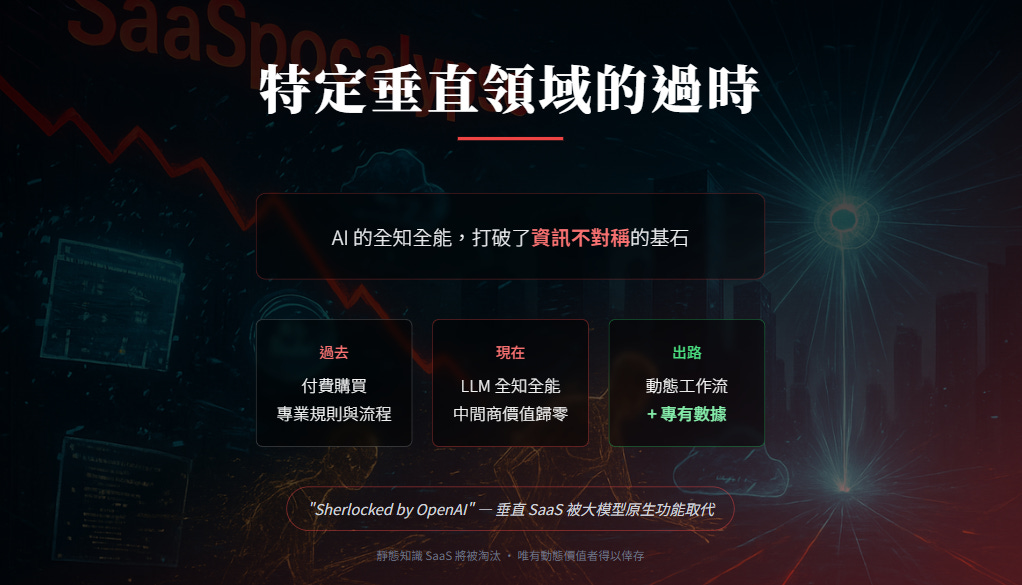 許多垂直領域 SaaS (Vertical SaaS) 的存在,本質上是建立在「資訊不對稱」或「流程繁瑣」之上的。AI 的全知全能打破了這種不對稱。
