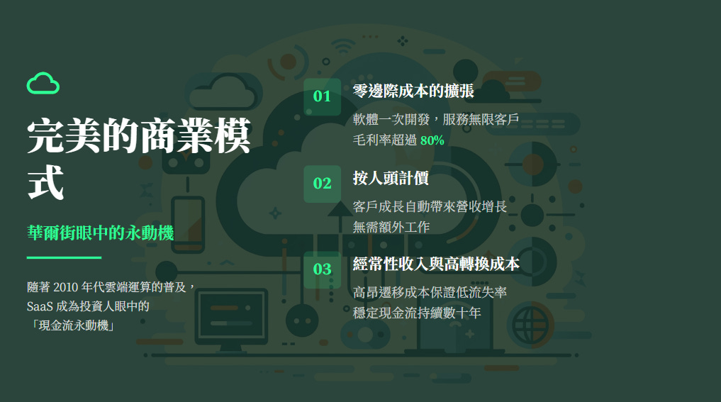 隨著 2010 年代雲端運算的普及,SaaS 的財務模型被打磨得近乎完美,成為投資人眼中的「現金流永動機」: