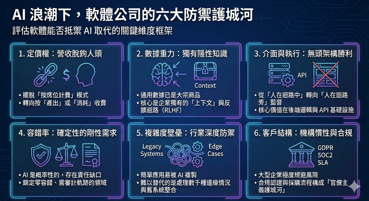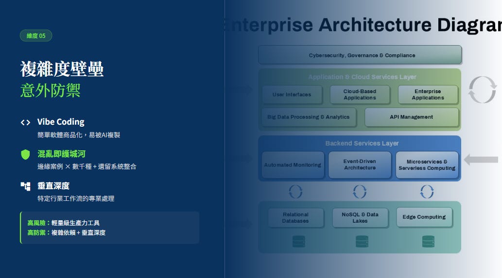 這種糾纏不清的系統複雜度,是 AI 目前難以輕易理解並複製的。垂直領域的深度與對特定行業工作流的掌控,將比通用的技術優越性更具生存韌性。