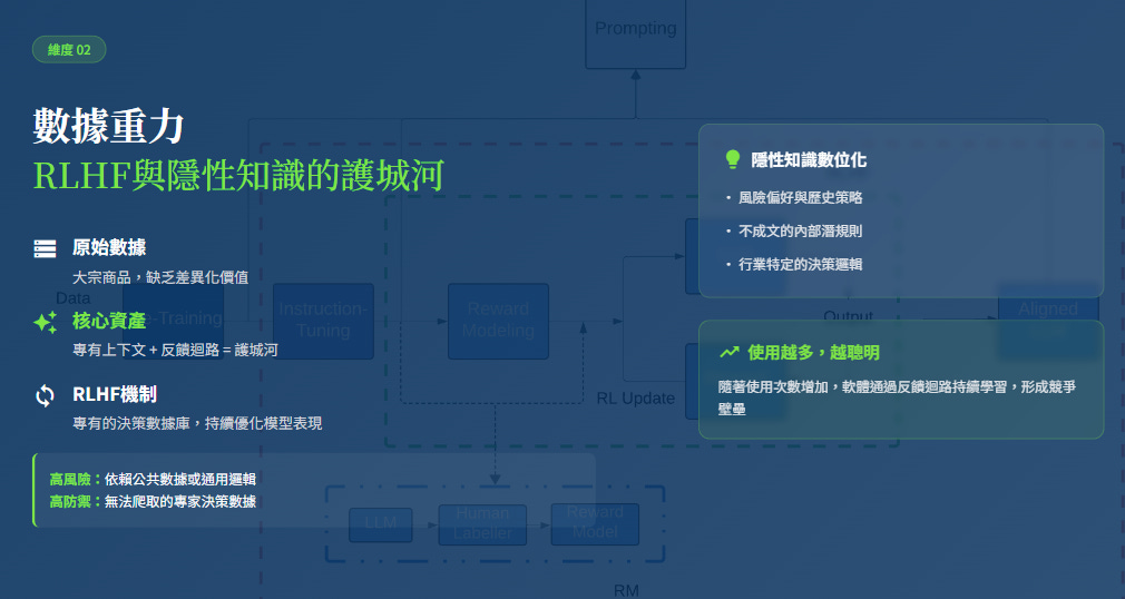 這種無法被輕易編碼的「隱性知識 (Tacit Knowledge)」,必須透過專有的「人類反饋強化學習 (RLHF)」機制來捕捉。能將此類知識數位化的軟體,將隨著使用次數增加而構建出難以跨越的護城河。