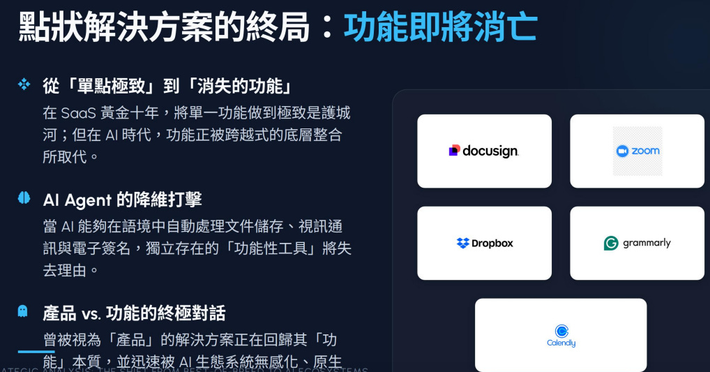 功能化: 90% 的點狀 SaaS 將消失,變成微軟或 Google 生態系中的一個按鈕。