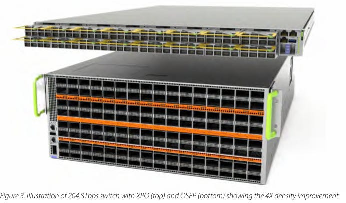 XPO 的體積 大約是傳統 OSFP 的 2.7 倍,這讓它有空間塞進雙面電路板,使單一模組的頻寬達到驚人的 12.8Tbps,相當於一口氣抵掉 8 個傳統模組。