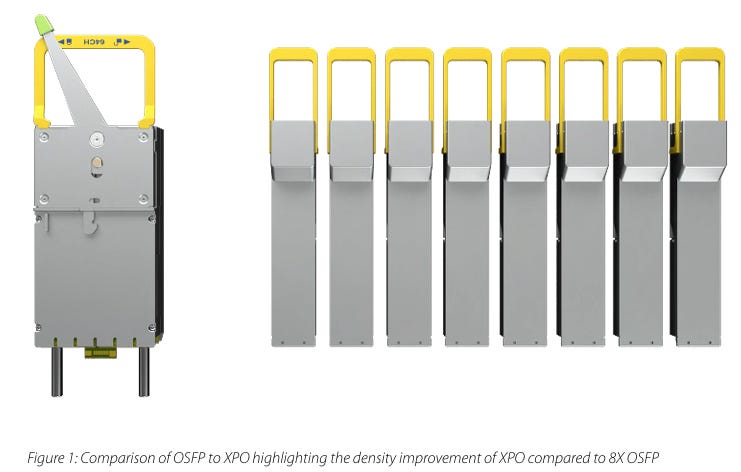 XPO MSA: 定義了 外接式大型光模組 的外殼、散熱設計與機械規格。它專為 Scale-out(機櫃之間的連線)設計,大幅提高前面板的模組密度與散熱能力,讓單一模組就能處理更高頻寬。