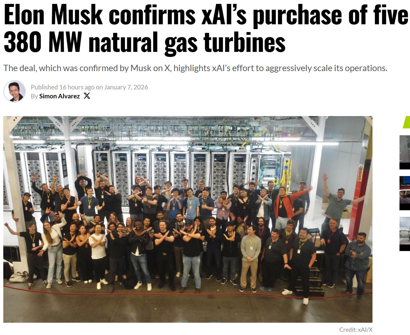 在最近,xAI斥資數十億美元,繞過傳統電網,直接採購近2 GW(吉瓦)的天然氣渦輪發電機組,在孟菲斯(Memphis)等地自建燃氣發電廠。