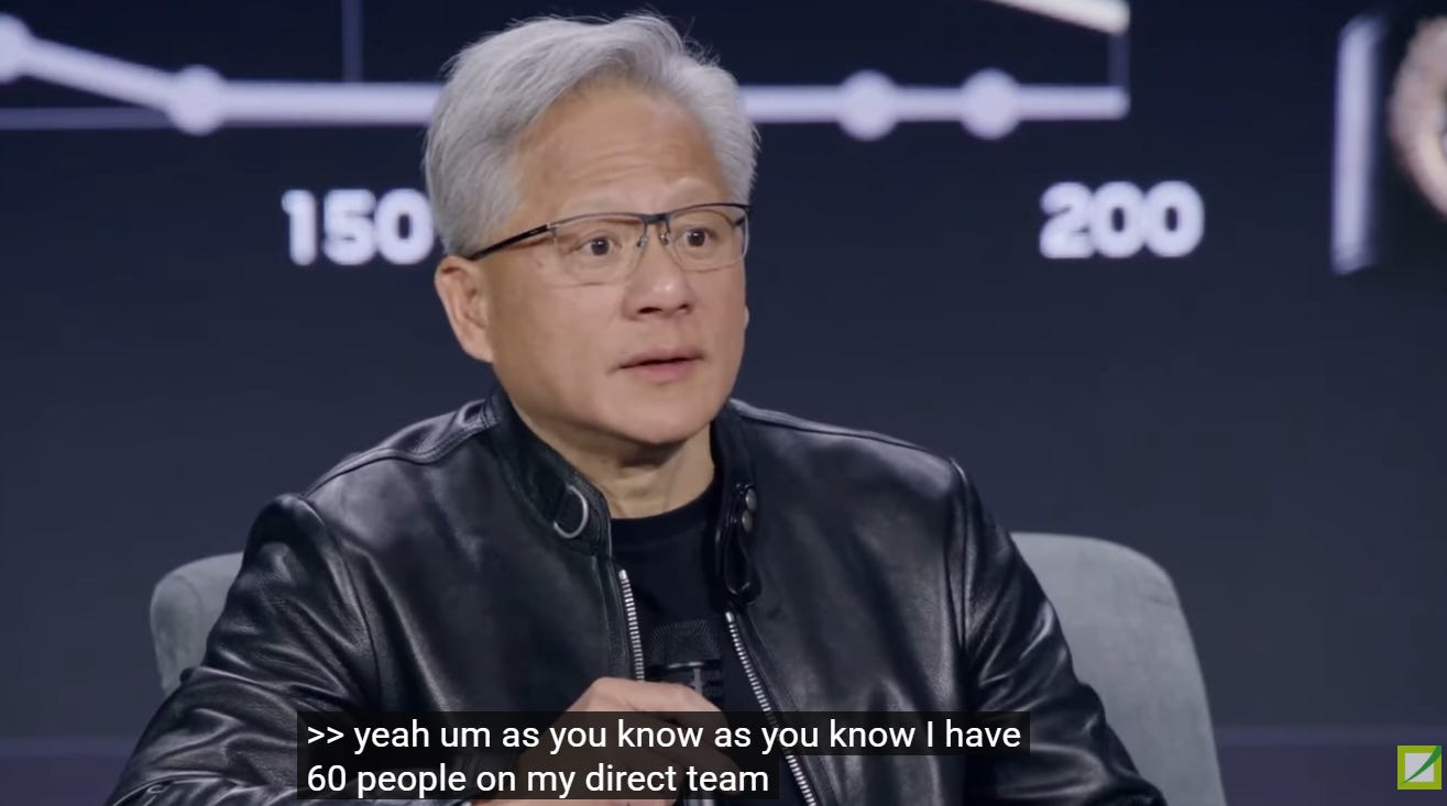 我特別感興趣的是黃仁勳的組織管理,他提到自己有 60 位直接下屬。