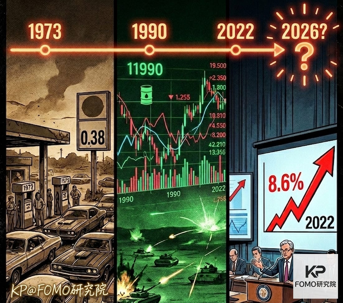 2026 年的油價衝擊比 2022 年大得多,但比 1973 年小得多,它落在 1990 年的區間裡。